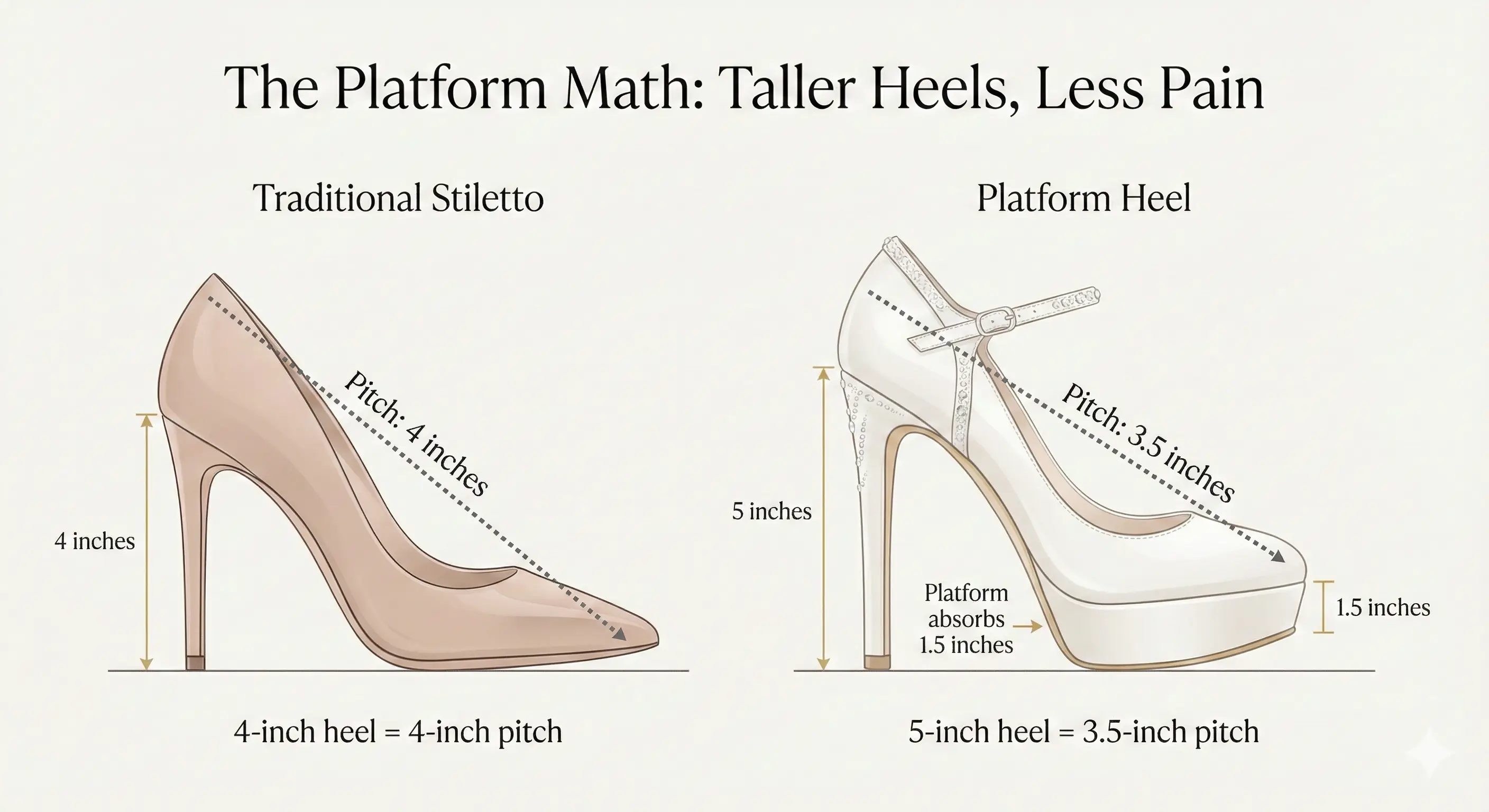Here's the secret: A 5-inch heel with a 2-inch platform actually puts your foot at a 3-inch angle. You get supermodel legs with bootie-level comfort. That's why brides who could afford Jimmy Choos still grab Jessica Simpsons for the reception.