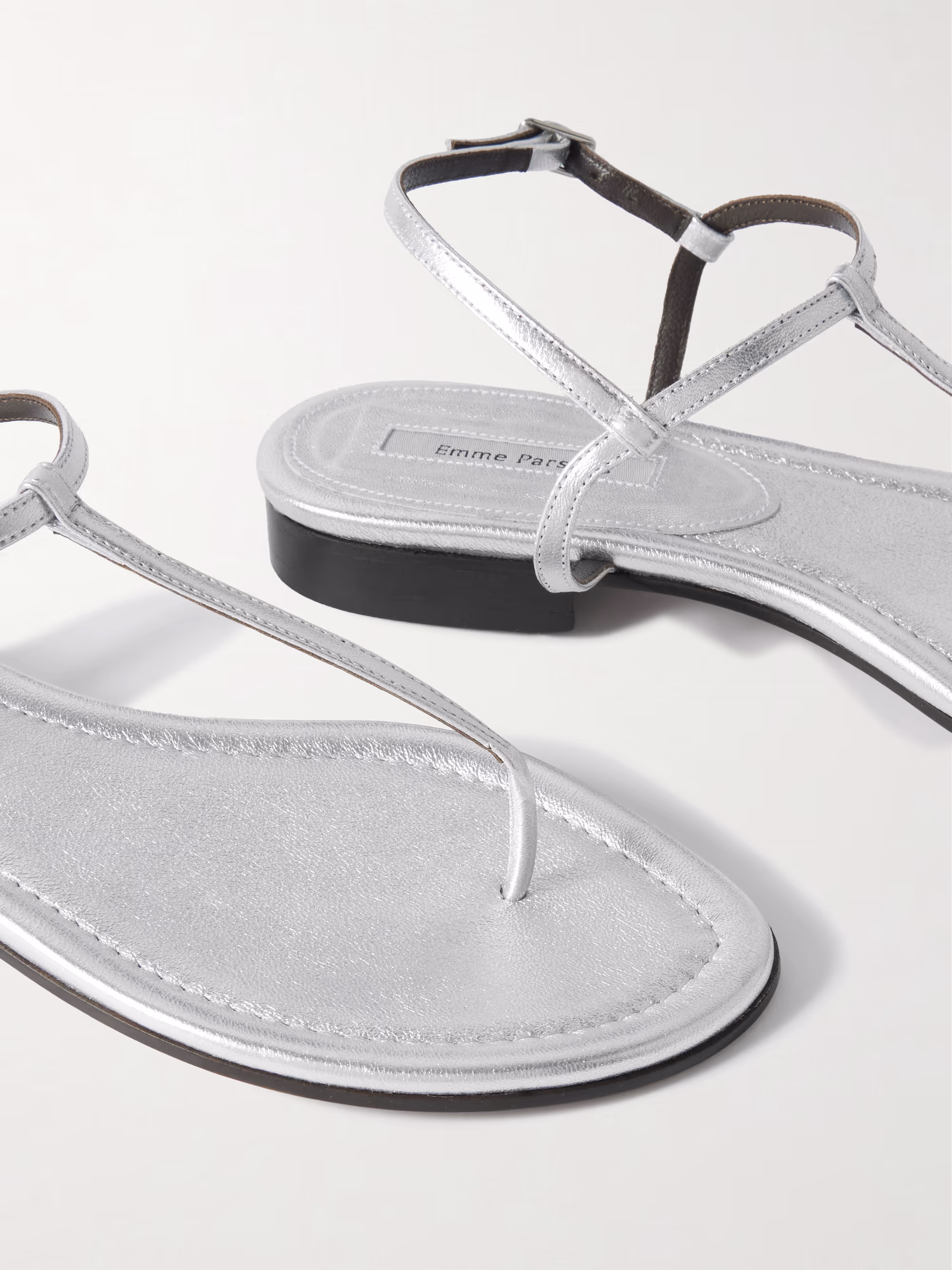 Emme Parsons' 'Cecilia' sandals in soft silver metallic leather exemplify the brand's belief that "pure design should be unobtrusive," featuring slim T-bar straps and a barely-there look.
