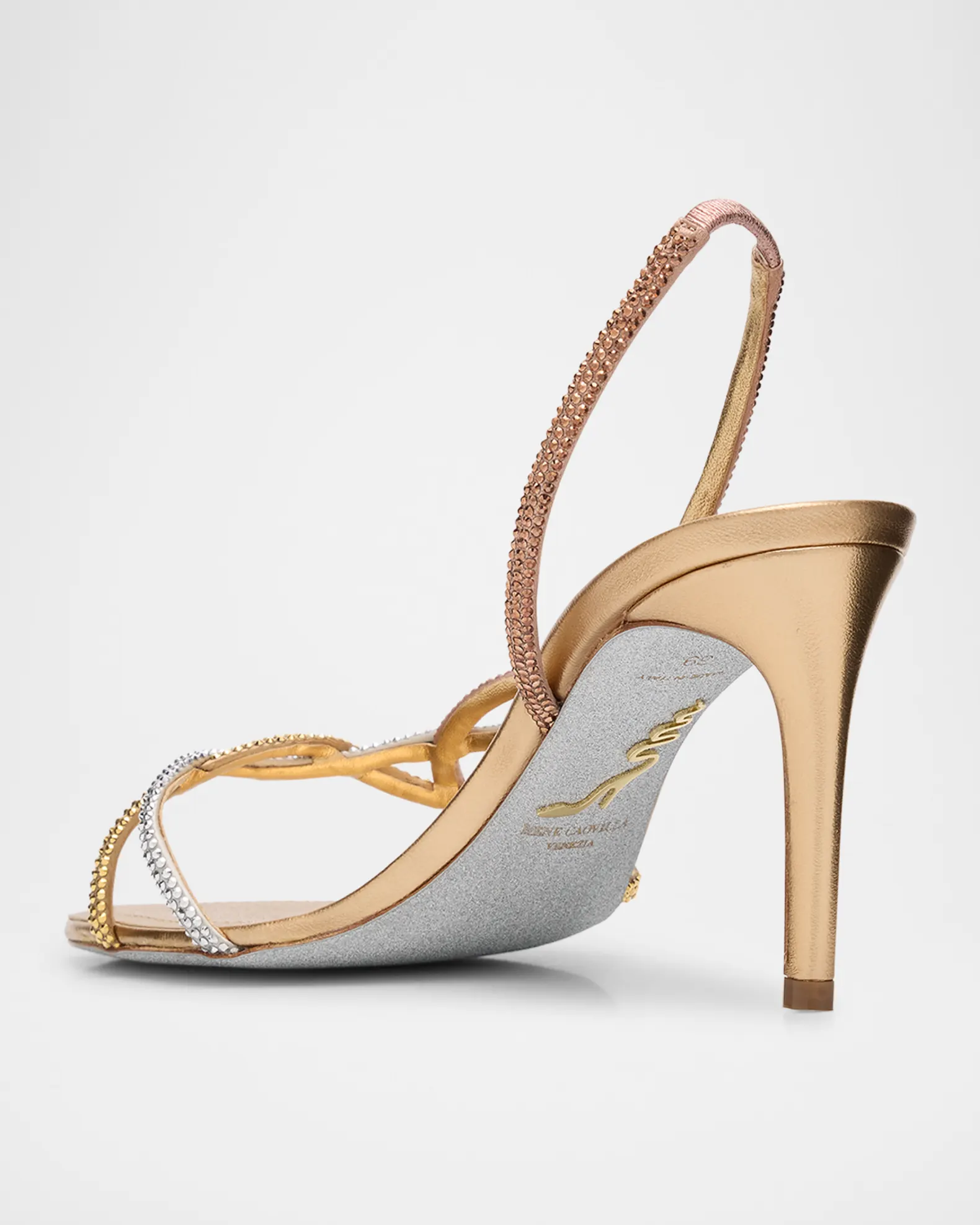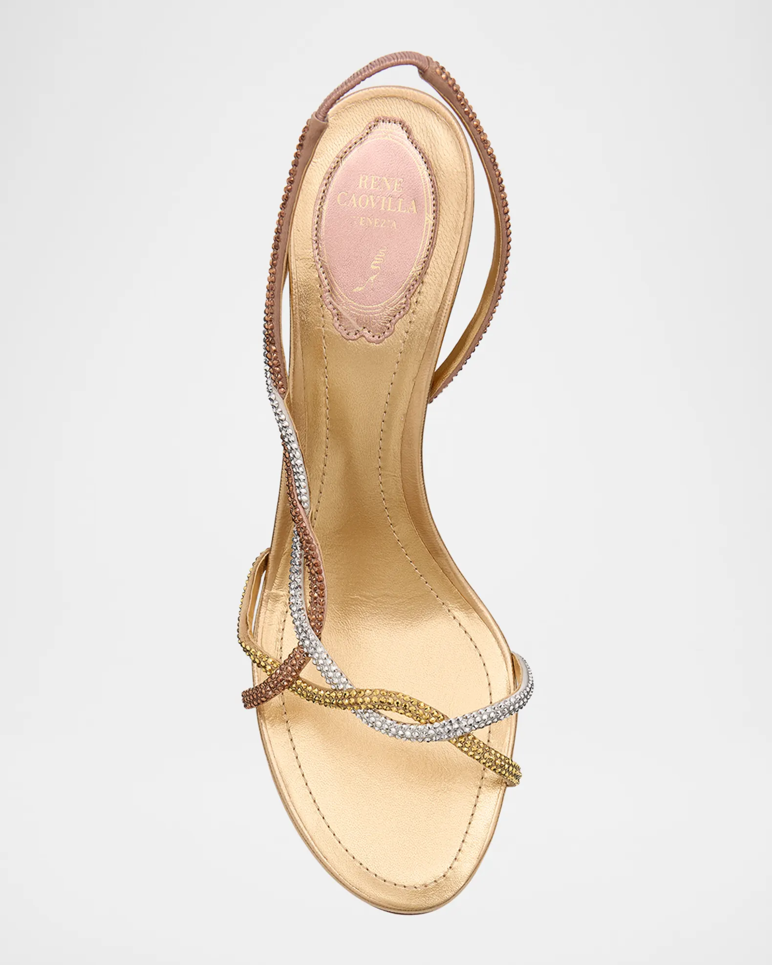 A couture-inspired Rene Caovilla sandal—braided satin straps with crystal accents for luminous movement.