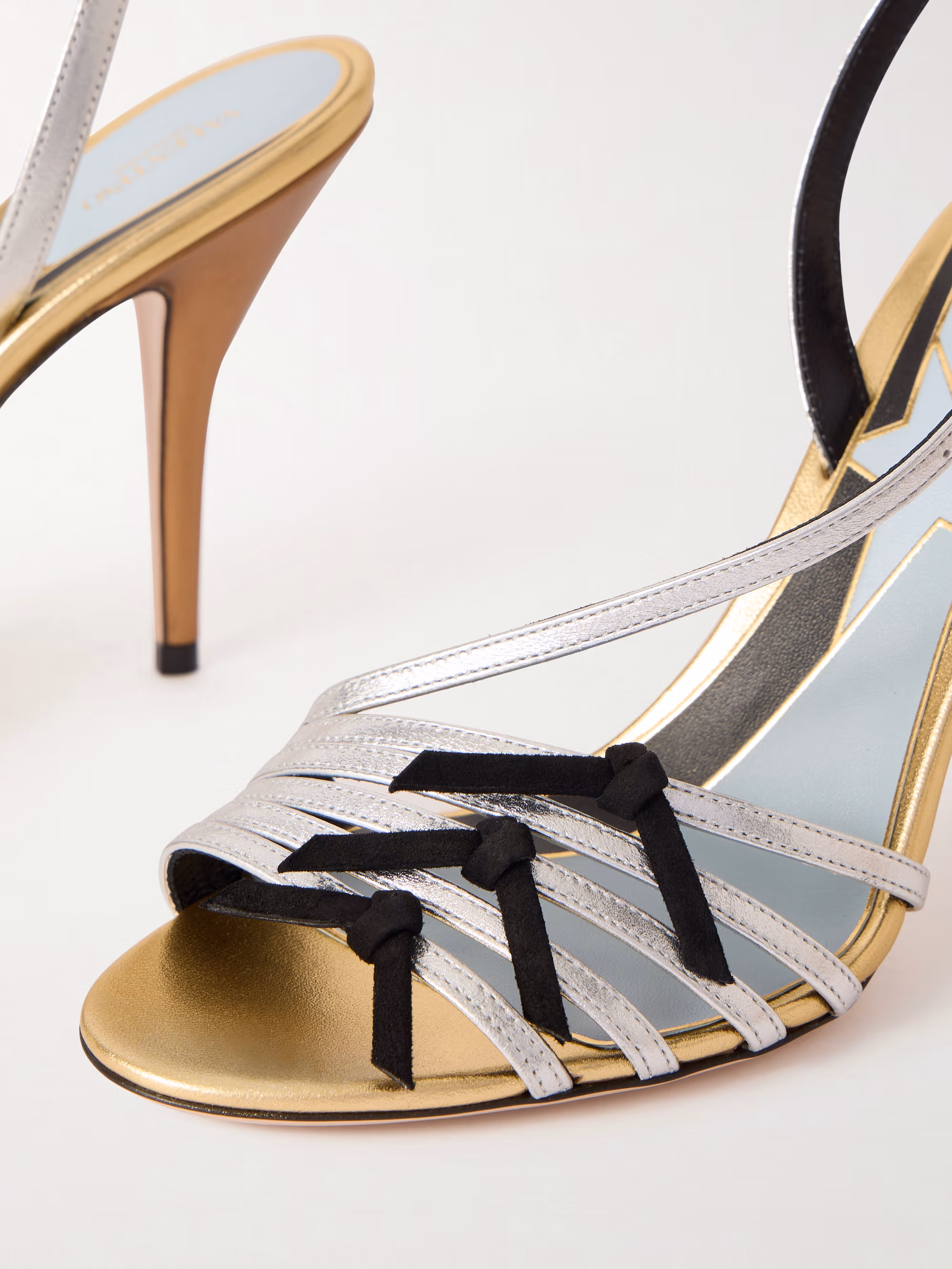 Valentino Garavani's 'Nodine' 100mm metallic leather sandals feature a trio of elegant bows, 'VLogo Signature' hardware, and a glamorous two-tone metallic finish for a show-stopping look.